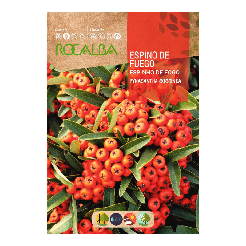 Semillas Espino de Fuego (Pyracantha coccinea), es un arbusto espinoso y perenne de la familia de las Rosáceas, conocido por su floración primaveral y su llamativa fructificación en otoño e invierno. Sus pequeñas flores blancas dan paso a bayas rojo-anaranjadas que permanecen durante toda la temporada fría, convirtiéndolo en una opción ideal para setos, cercos naturales y jardines ornamentales.